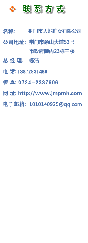 公司地:湖北省荊門市象山大道53號(hào)市政府院內(nèi)23棟三樓 電話(傳真):0724-2337606 手機(jī):13872931488